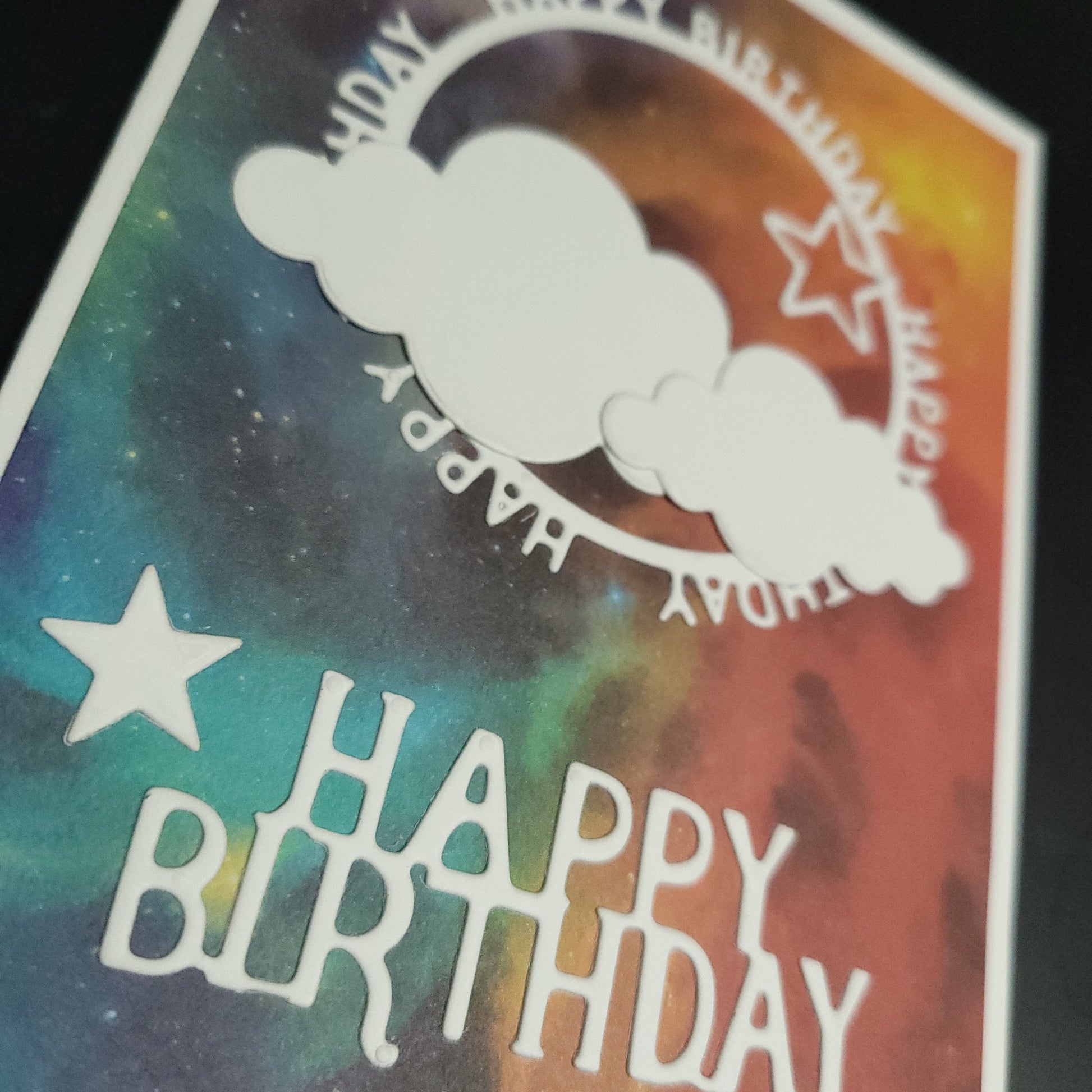 Galaxy background with cutout clouds and stars Happy Birthday blank greeting card.