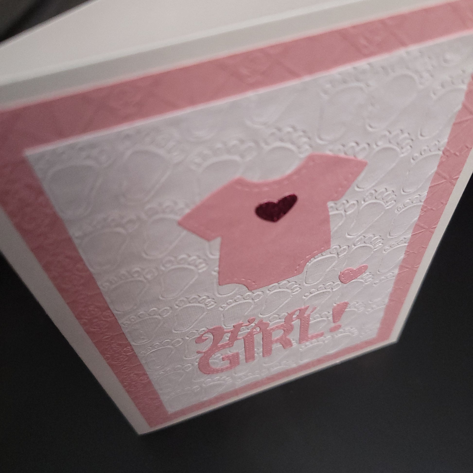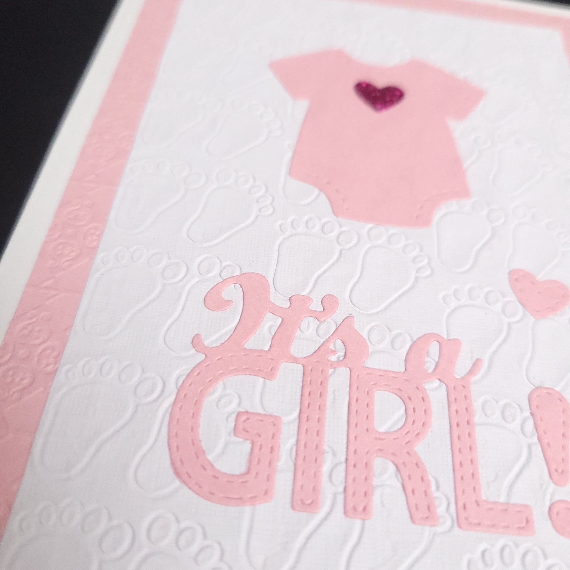 A6 Pink glitter heart onesie It's a Girl Baby blank card