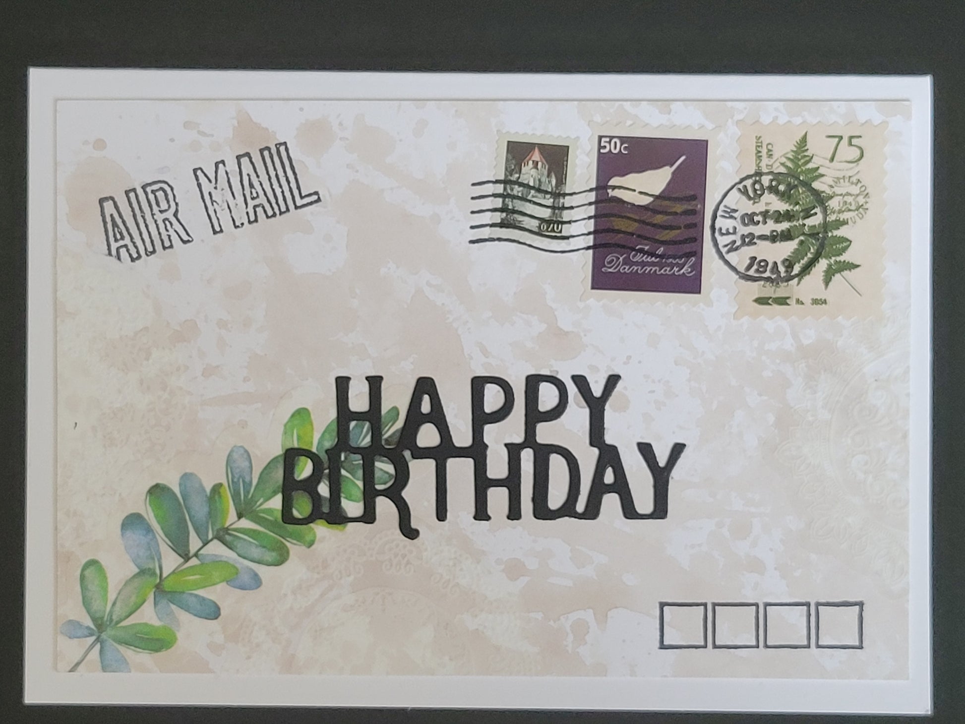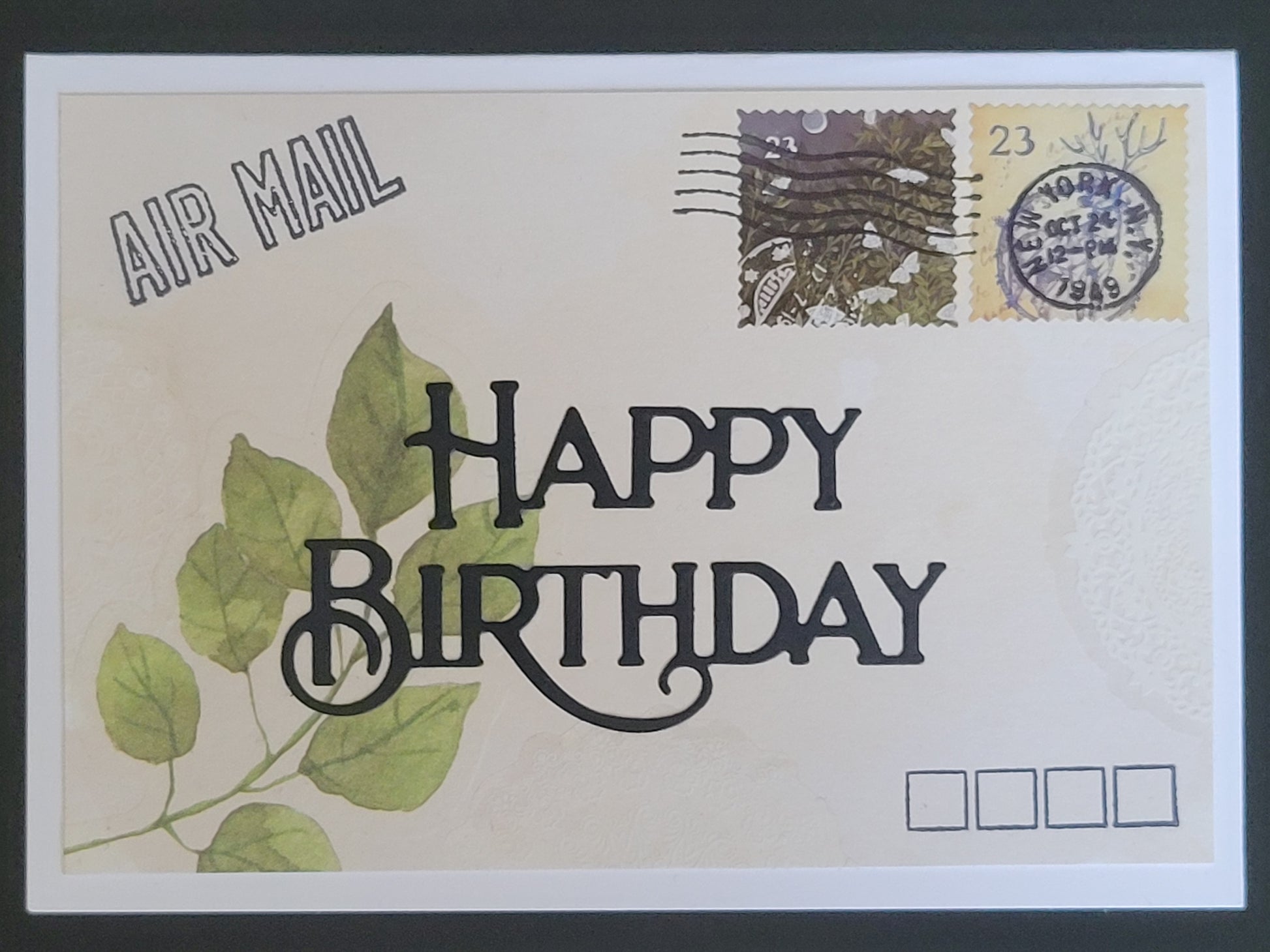 Hand dyed Tea dyed background with postal stamps and post office rubber stamped icons with rubber stamped air mail sign and Postcode squares. Flower/plant and lace details in background.