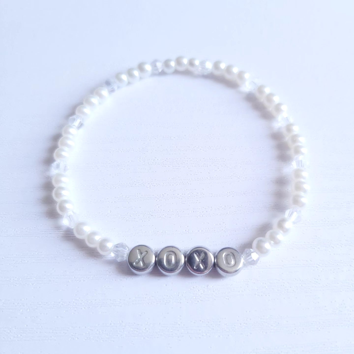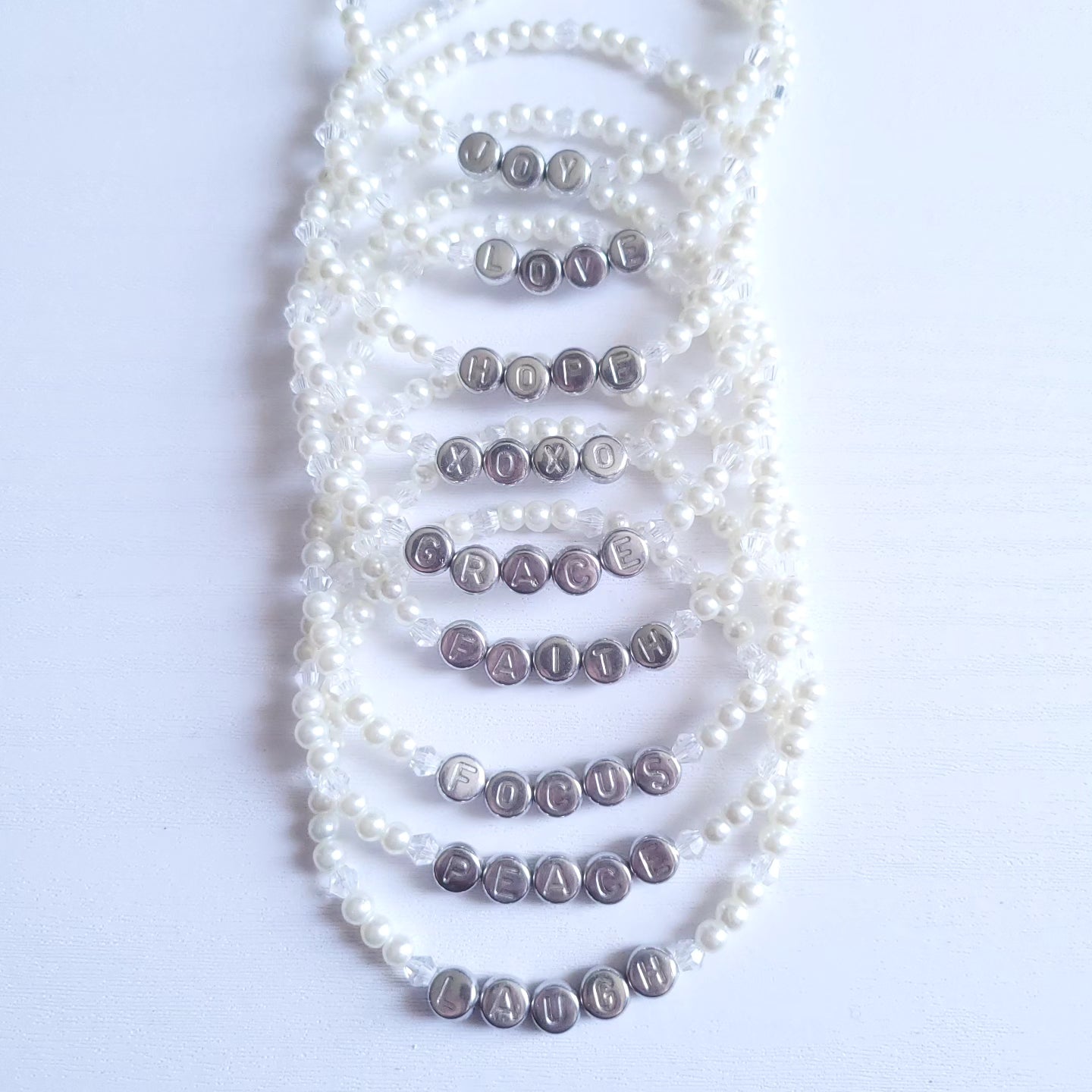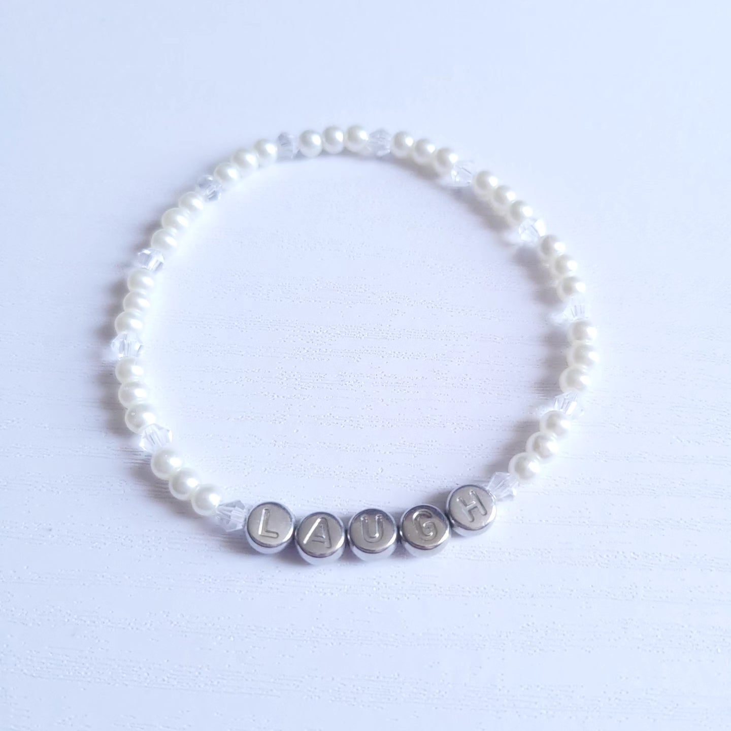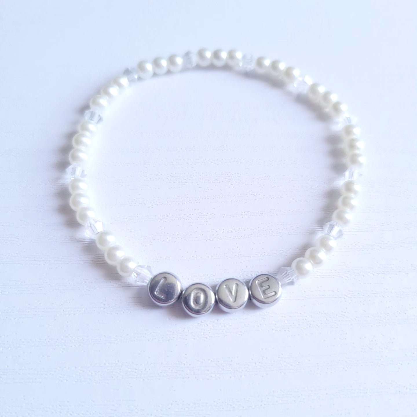 Letter bead message with glass pearls & crystal beads on stretchy bracelet elastic