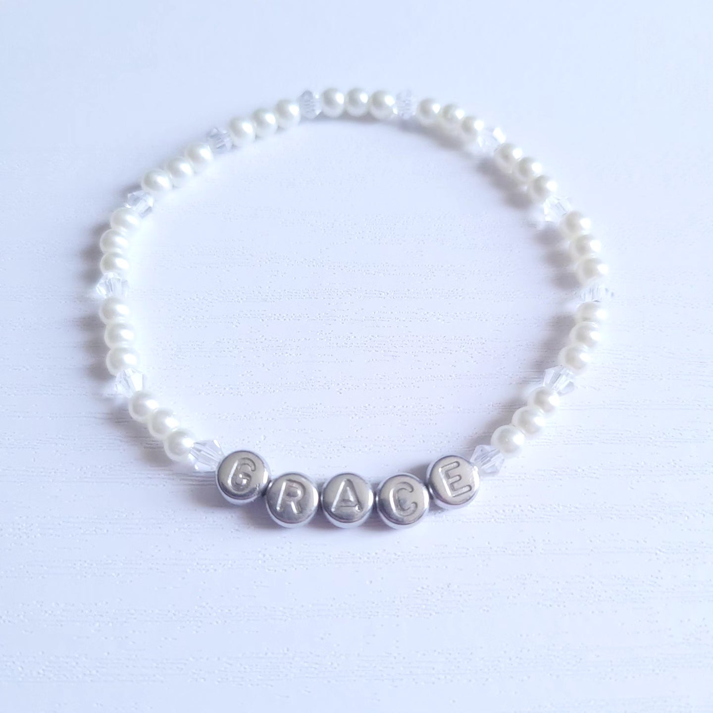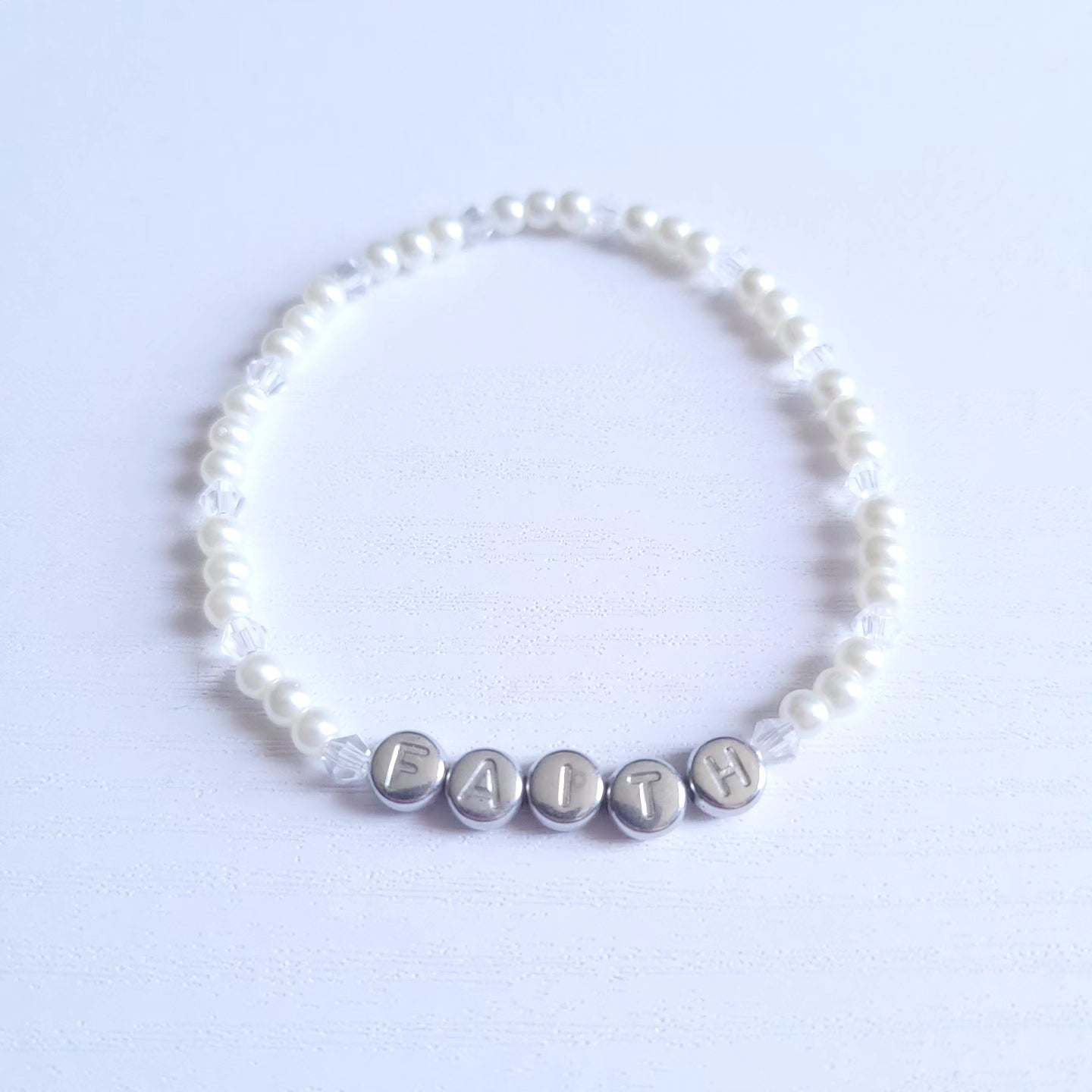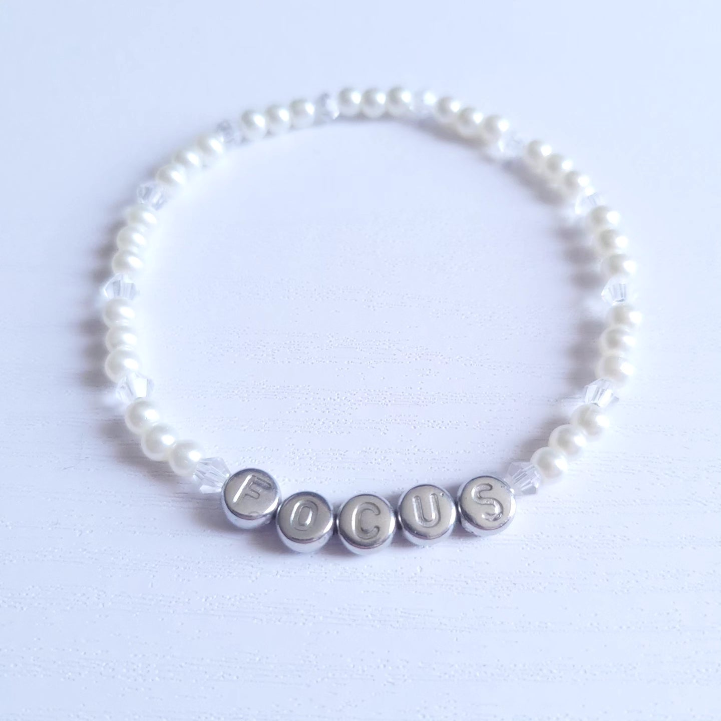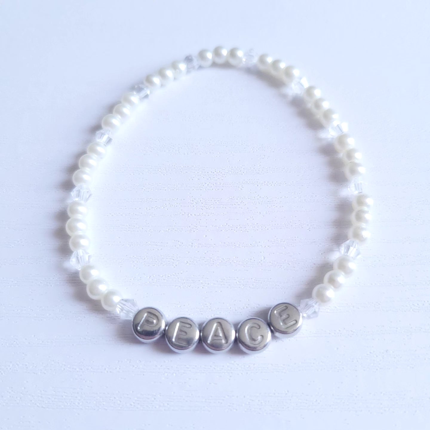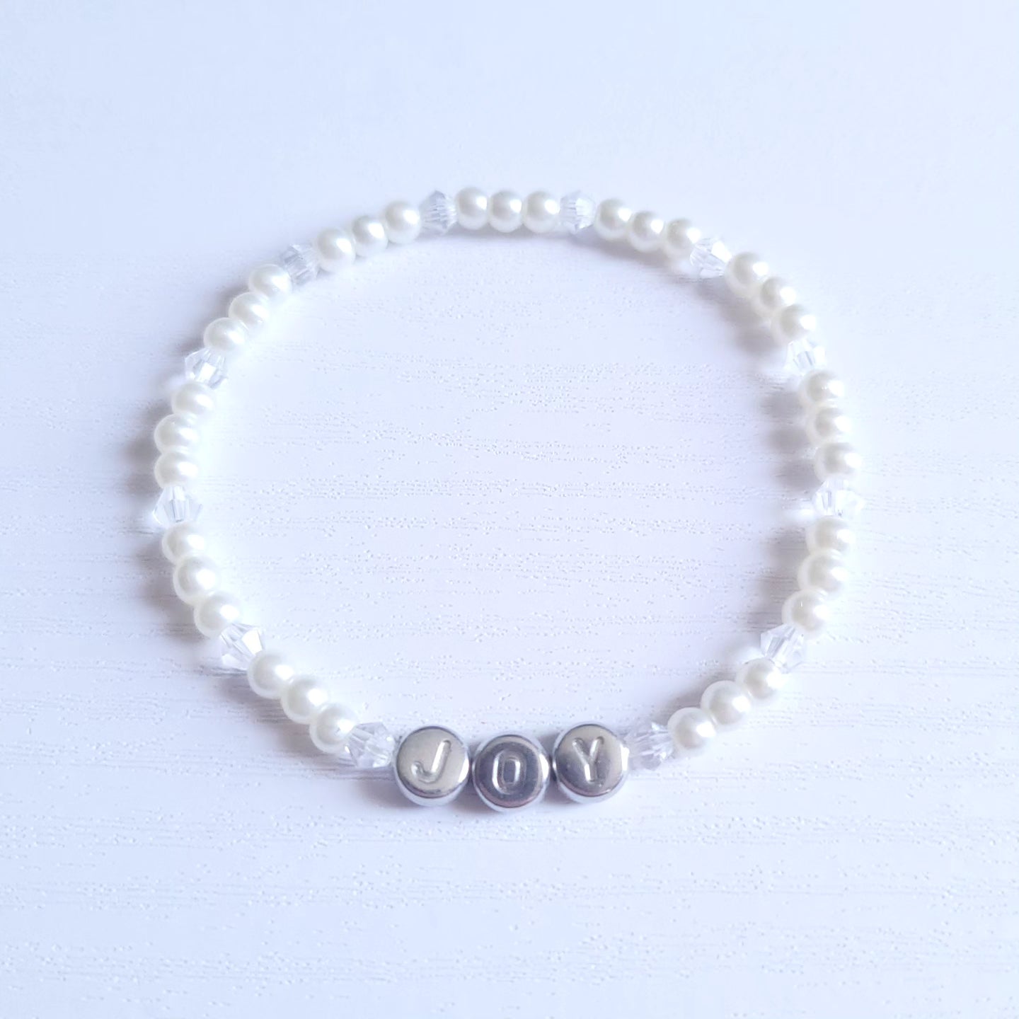 Letter bead message with glass pearls & crystal beads on stretchy bracelet elastic