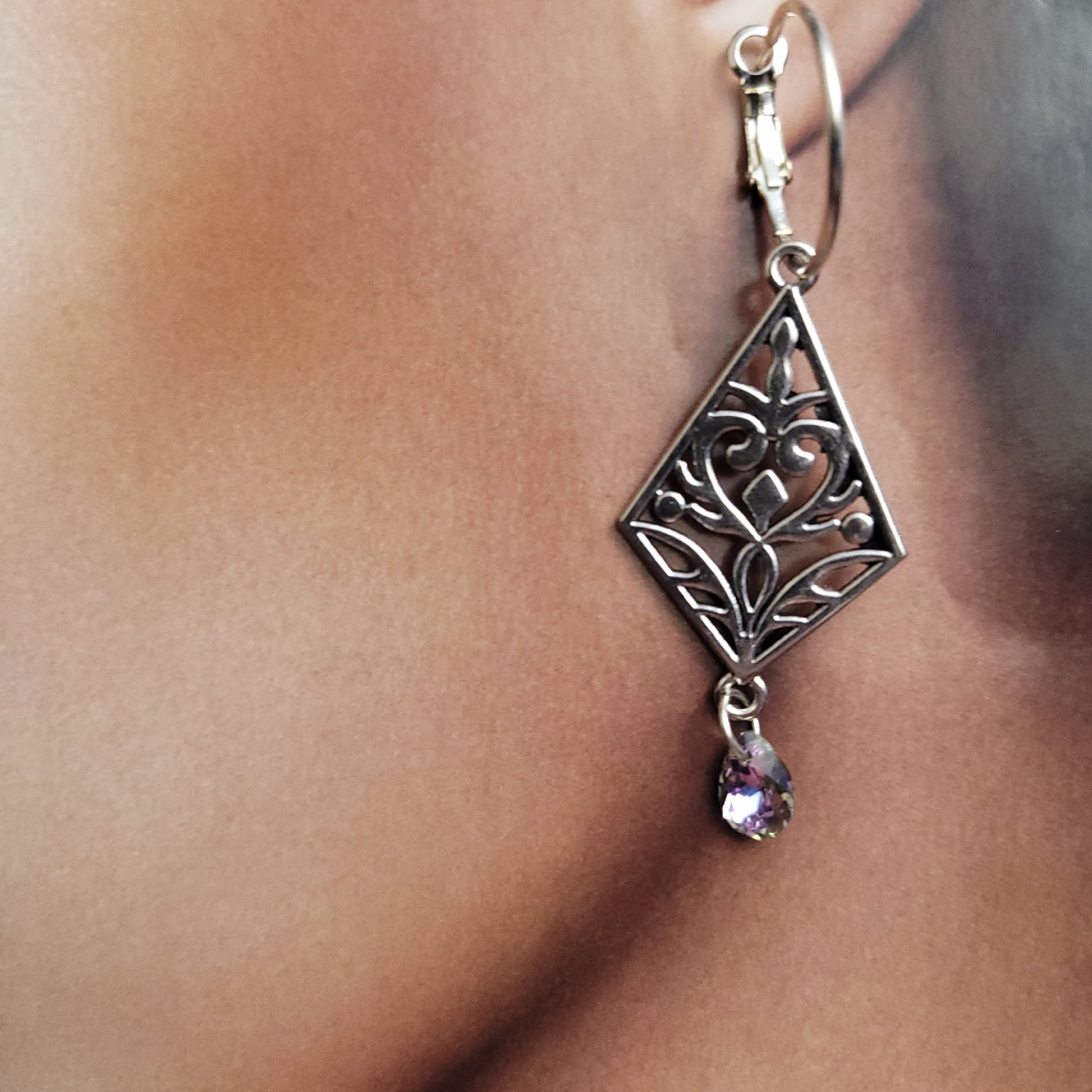 Selection of bohemian style earrings with Resin inlay and/or crystal, glass, rainbow hematite or Lava stone beads on silvery earrings hoops or studs or hooks.
