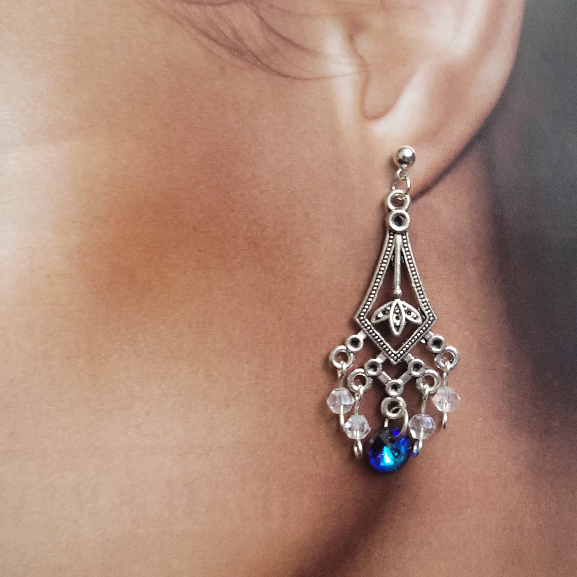 Diamond - Blue glass gem pendant and clear crystal beads - 5.2cm