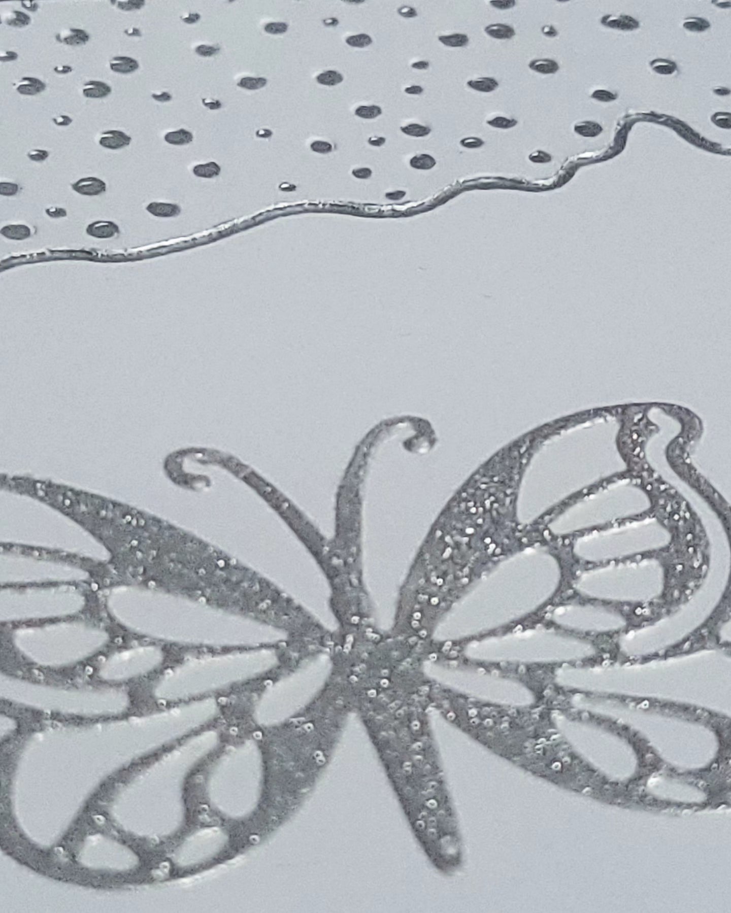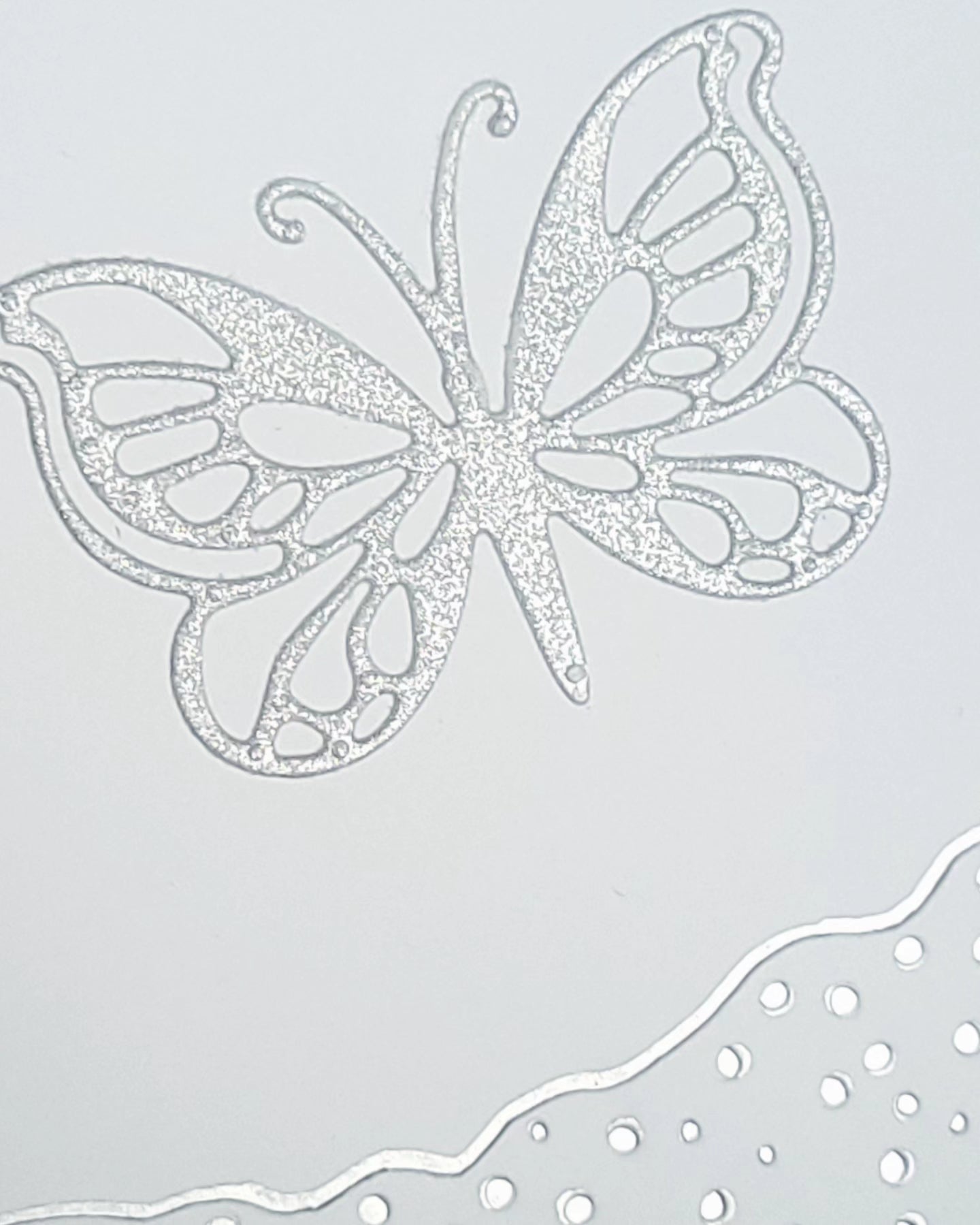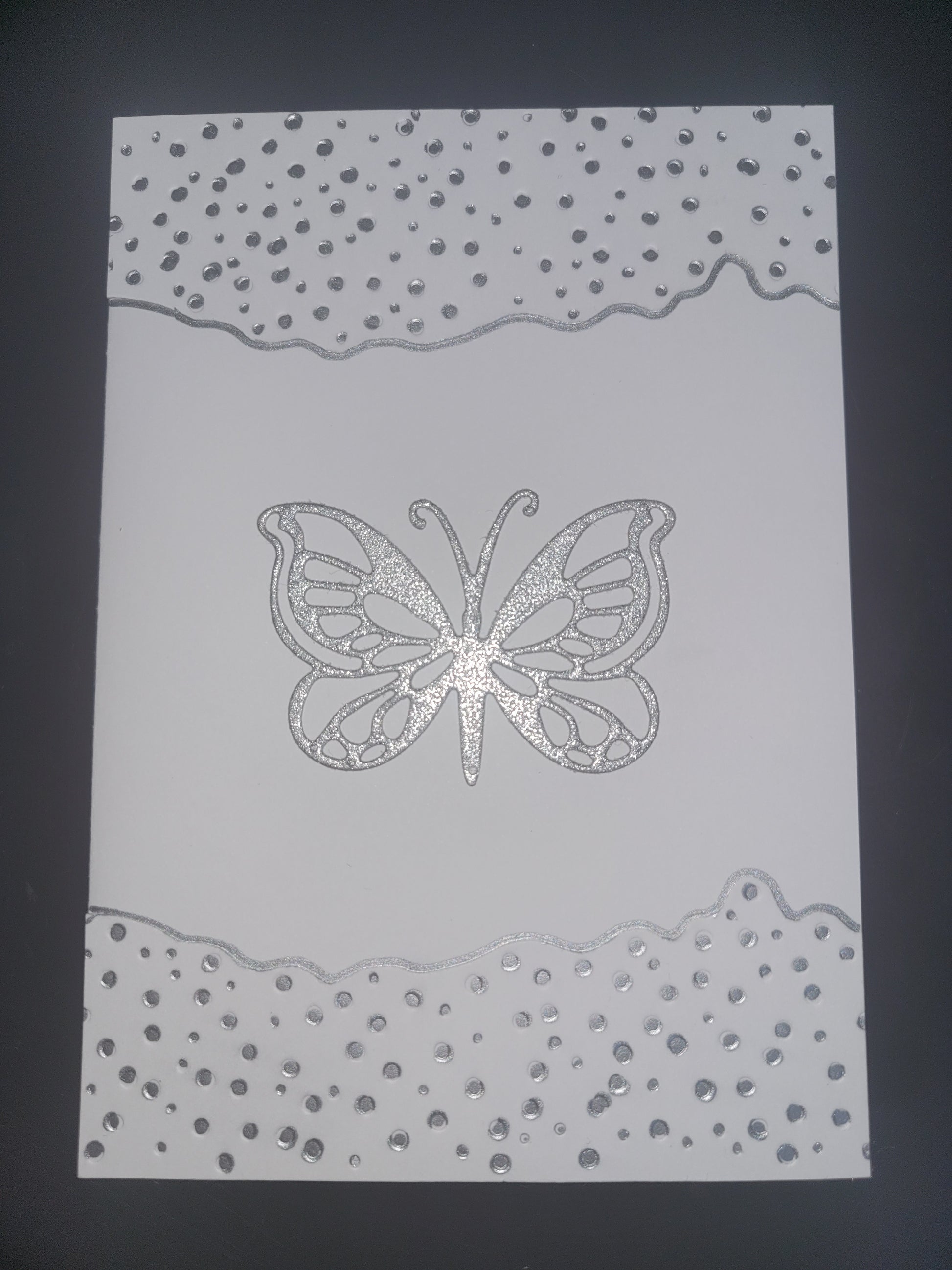 Single butterfly in silver glitter with indented embossed border detail with silver accents blank greeting card.