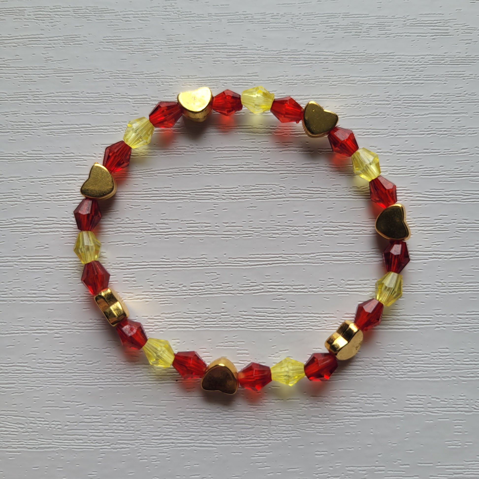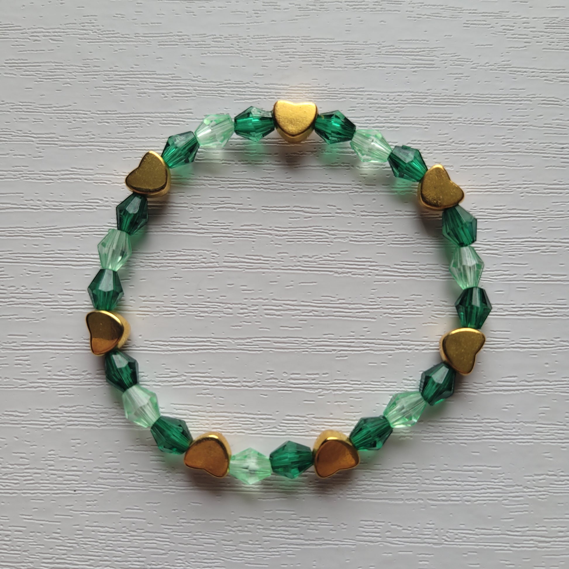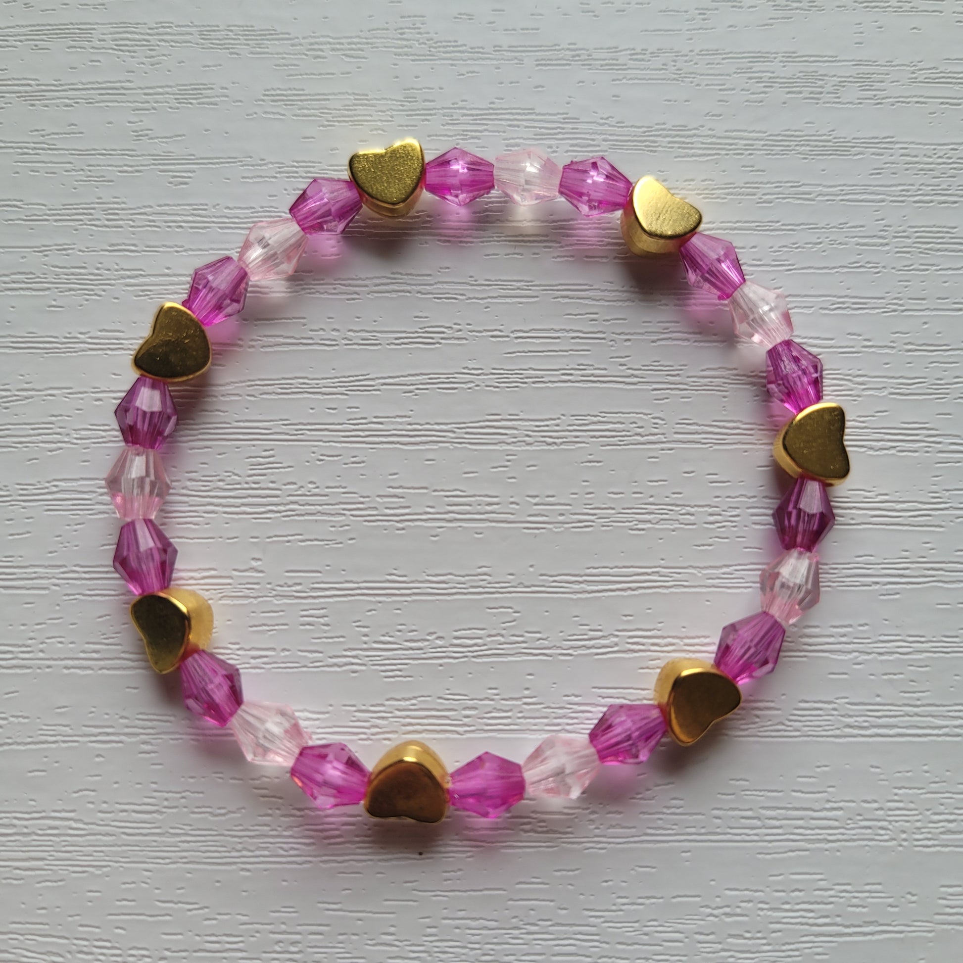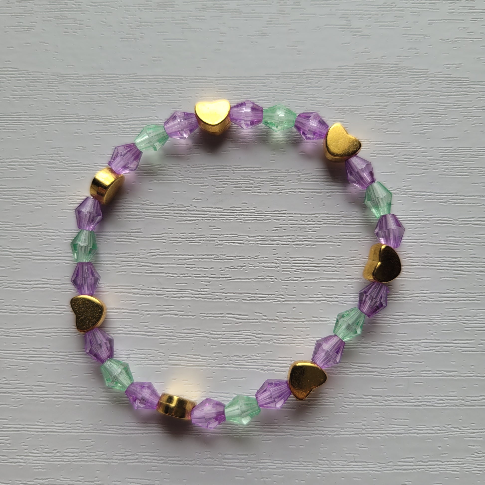 Plastic bicone gem colourful beads with gold heart beads on stretchy bracelet elastic
