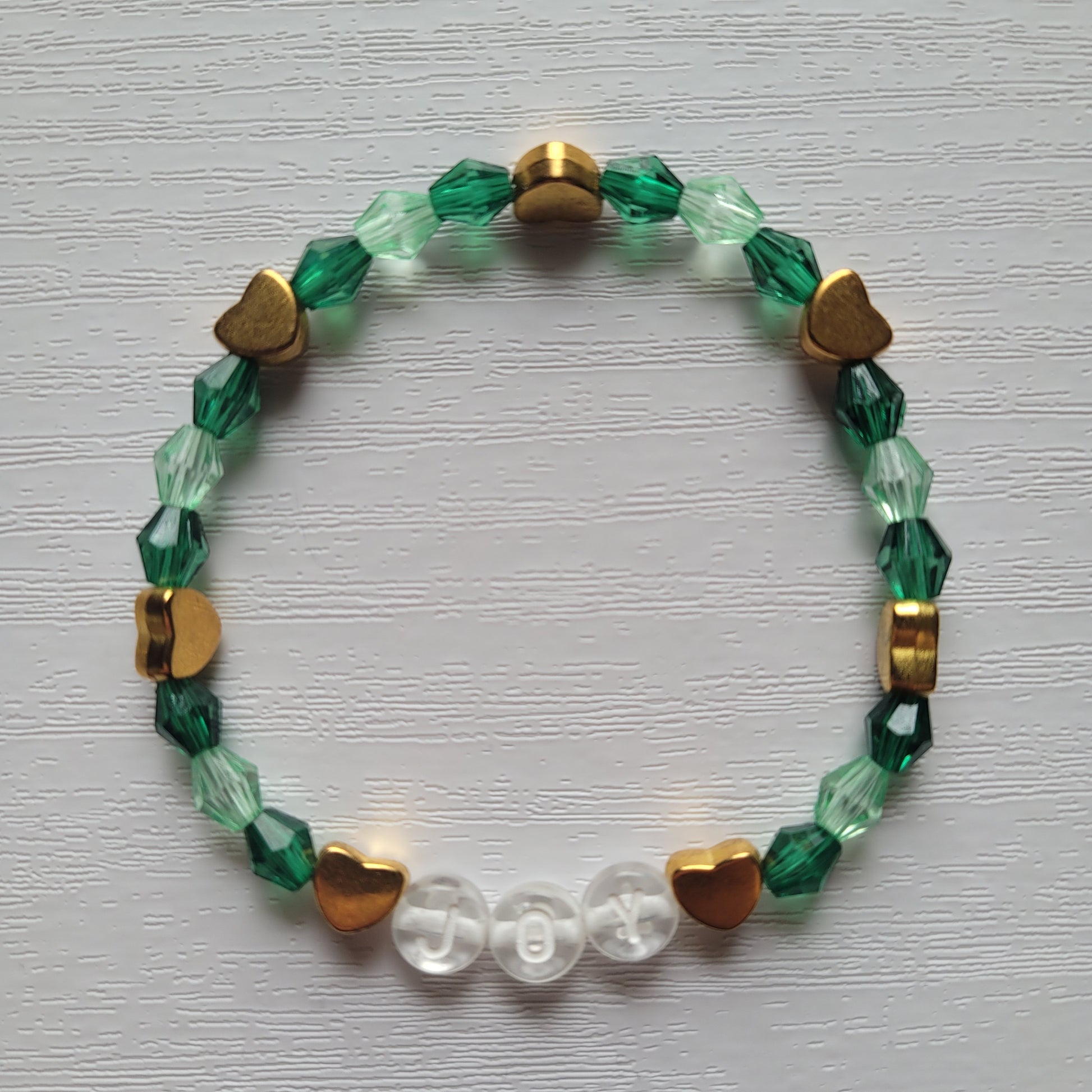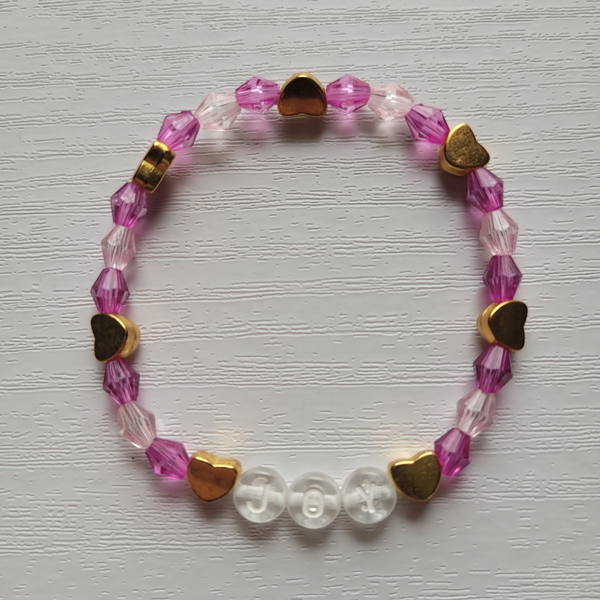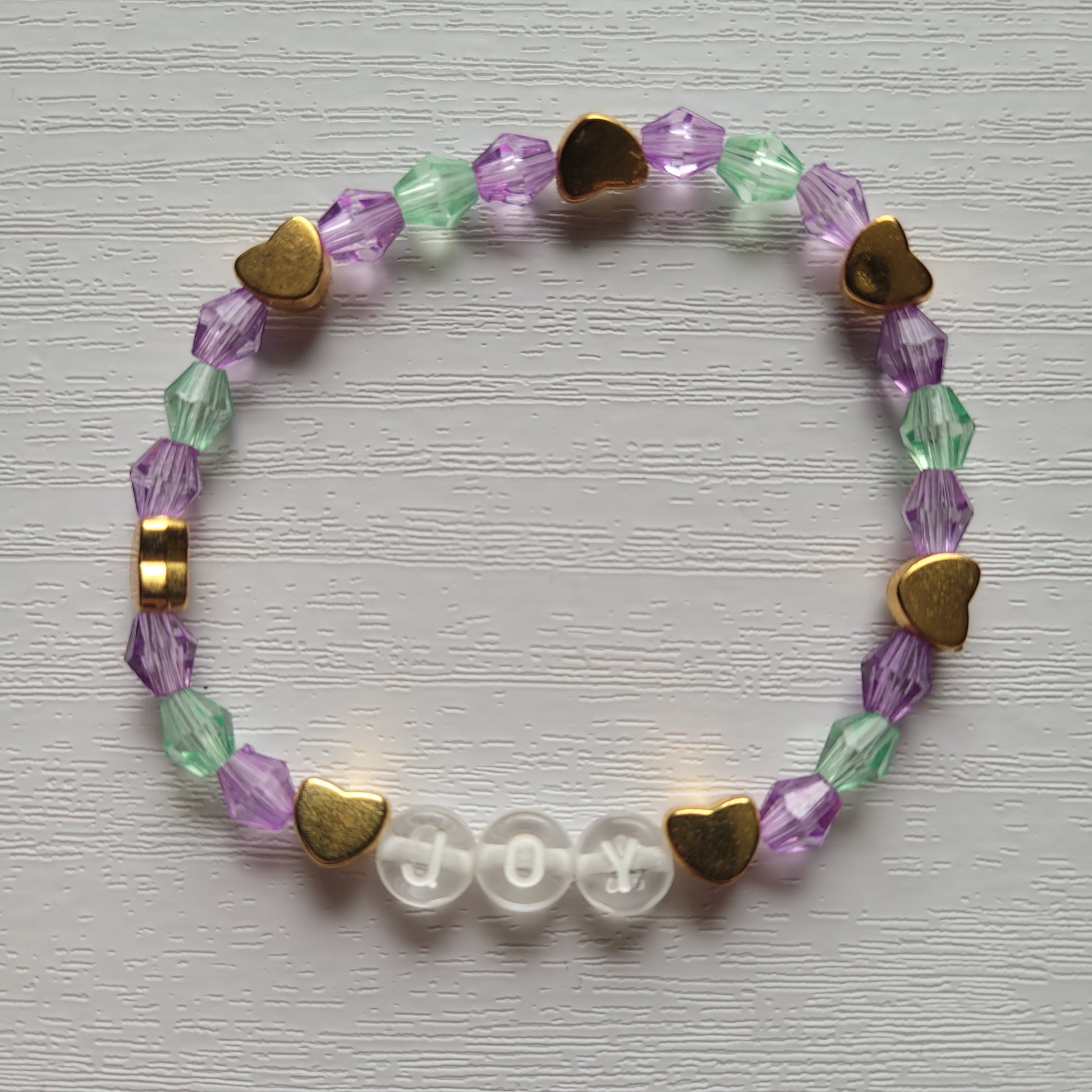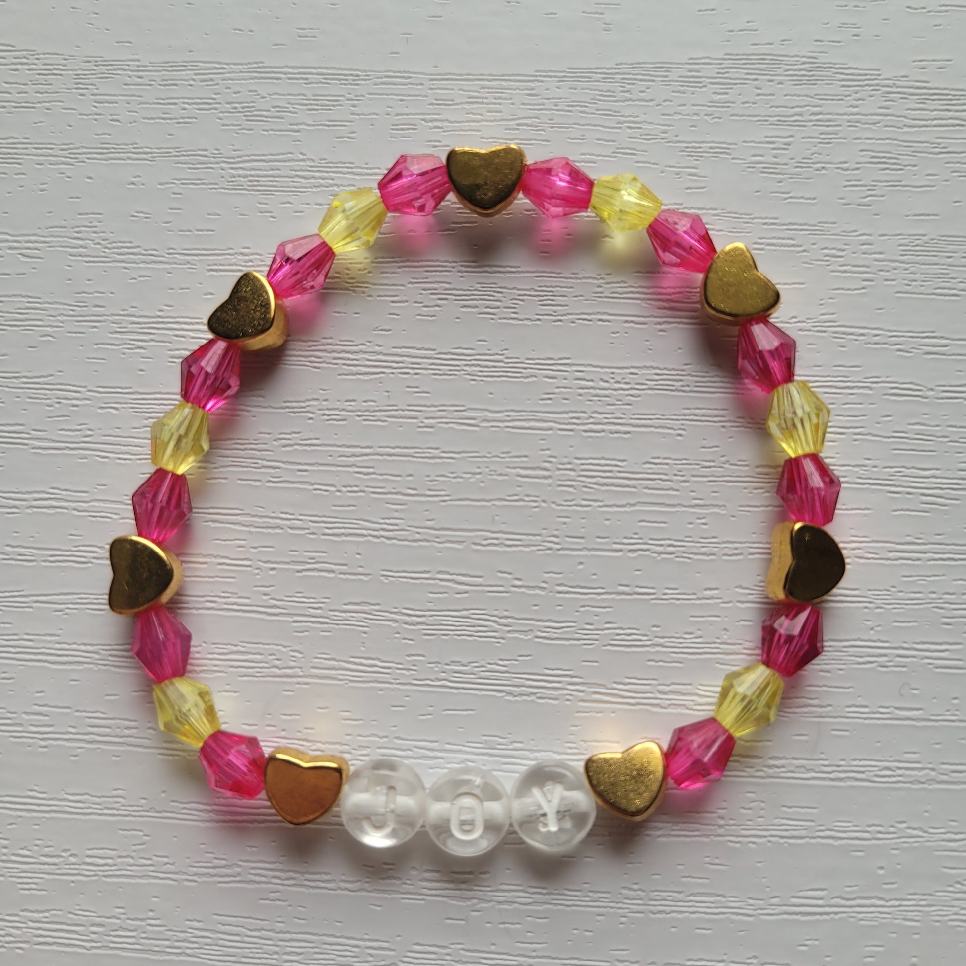 Plastic letter beads spell out JOY combined with bicone gem colourful beads with gold heart beads on stretchy bracelet elastic