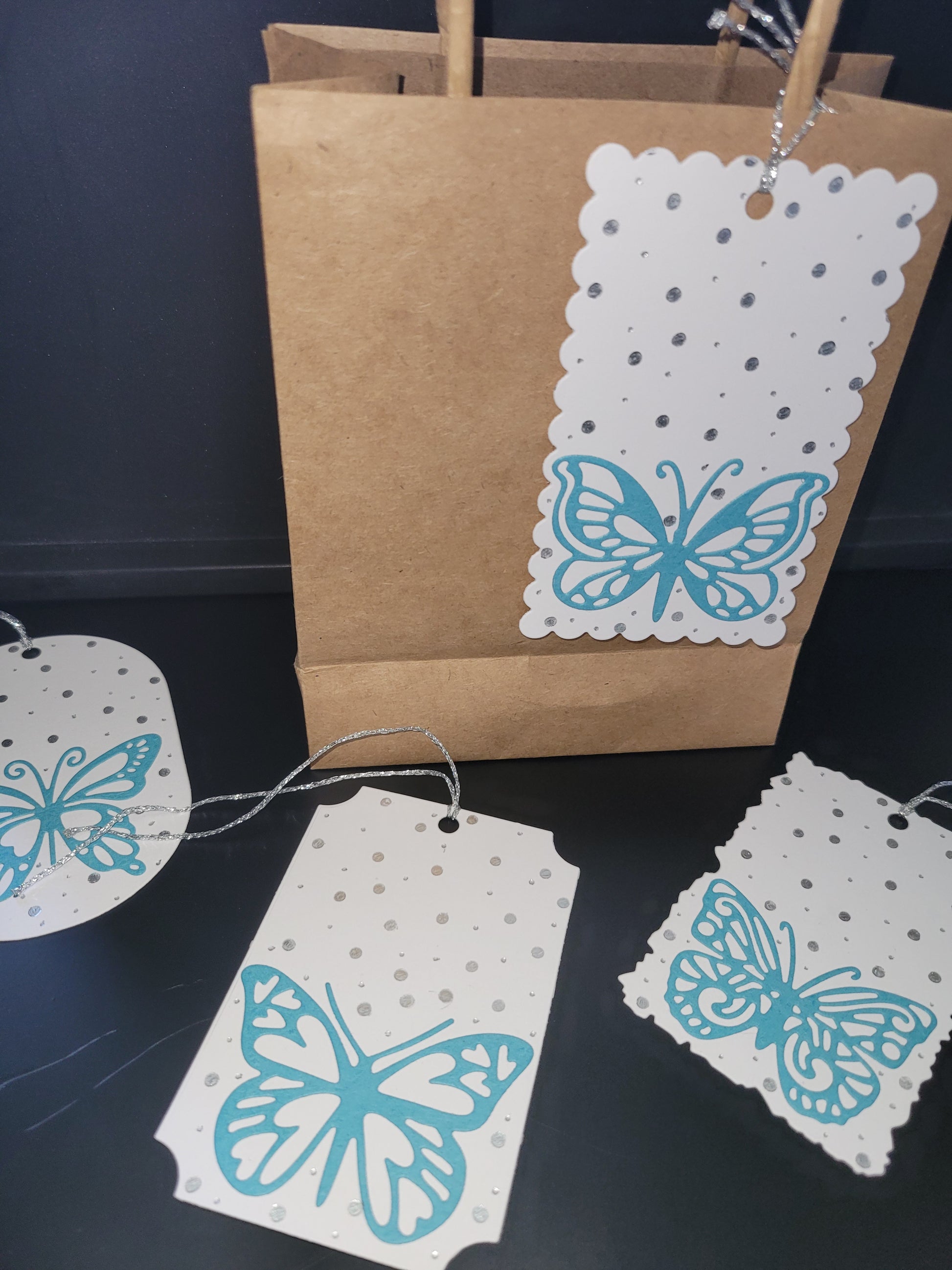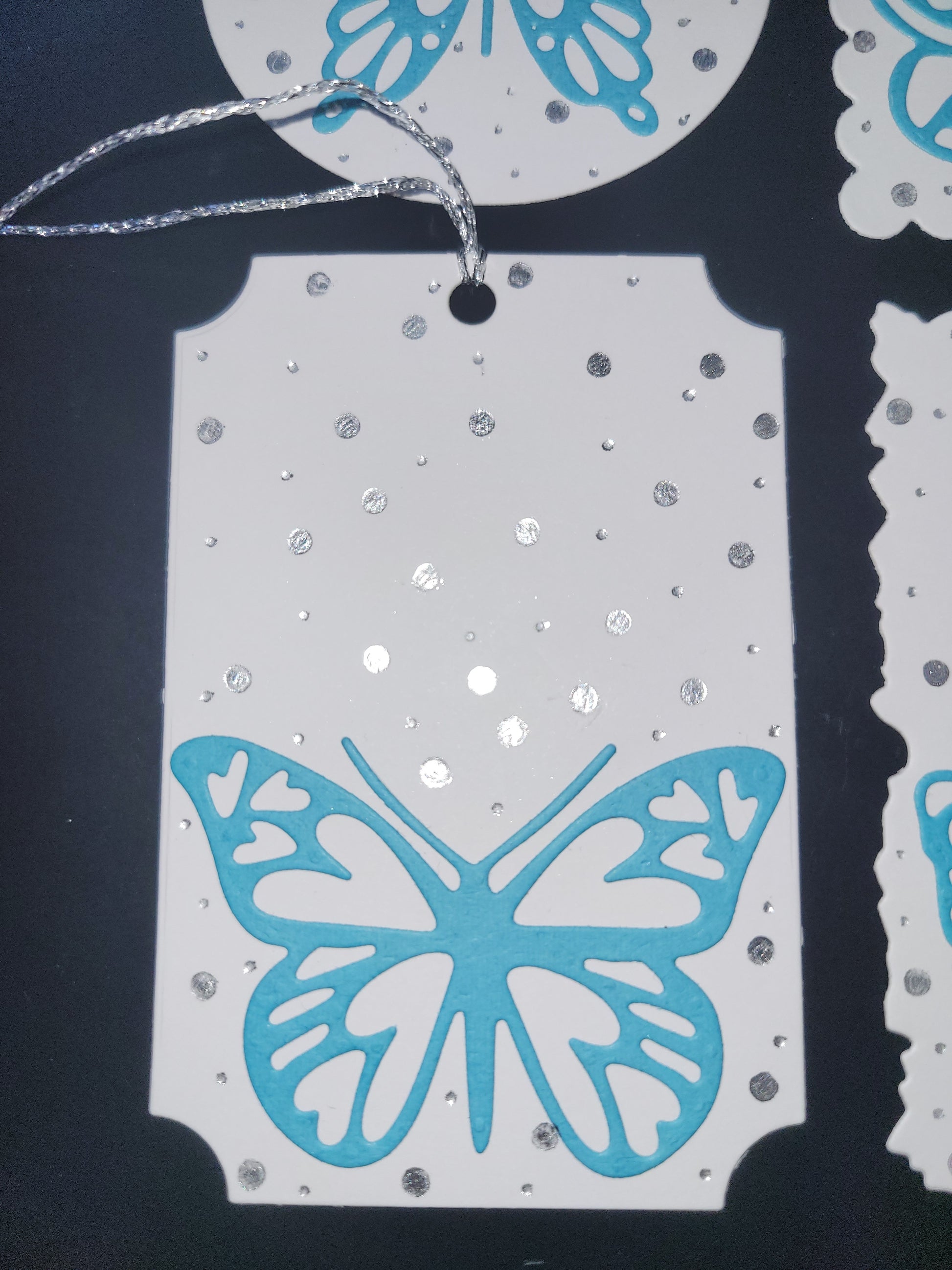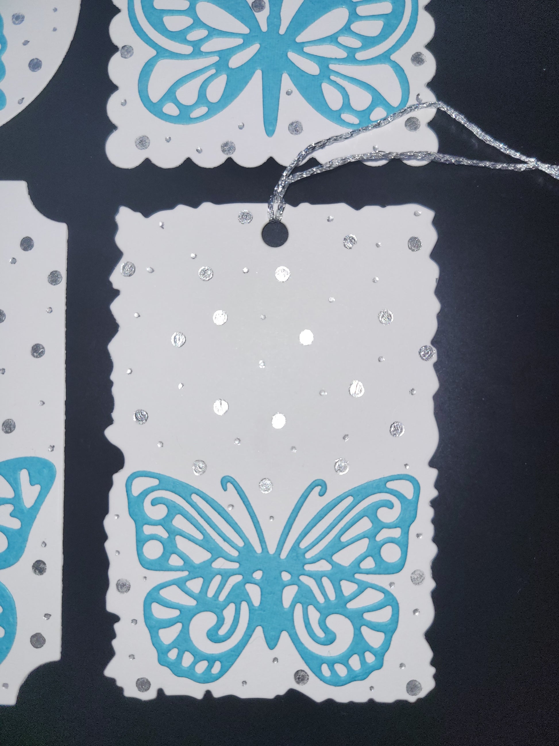 4 x 300gsm white card gift tags with coloured card butterflies embellished with foil dots.