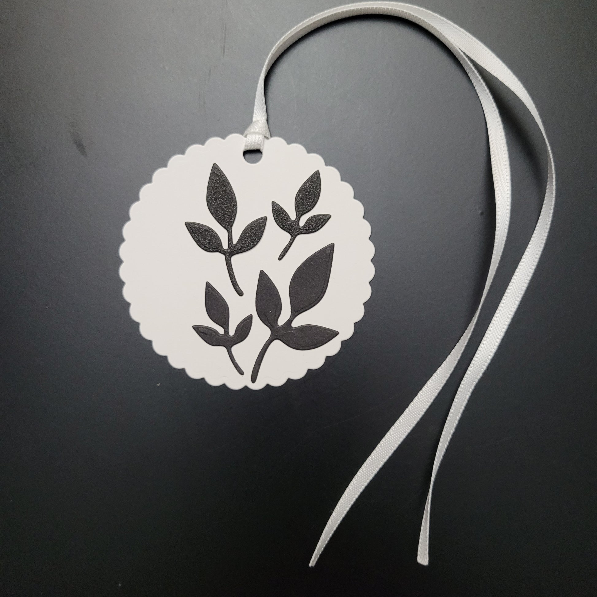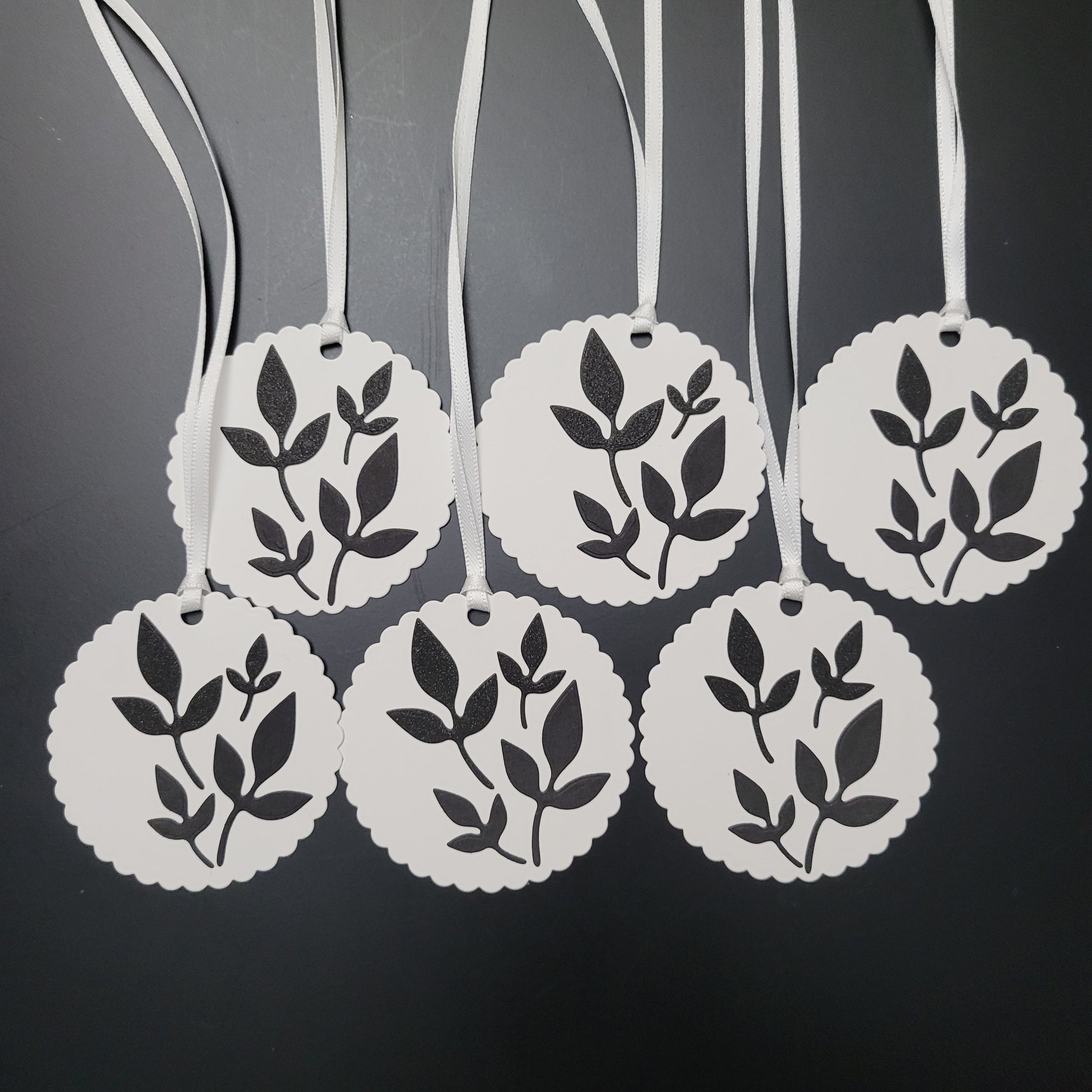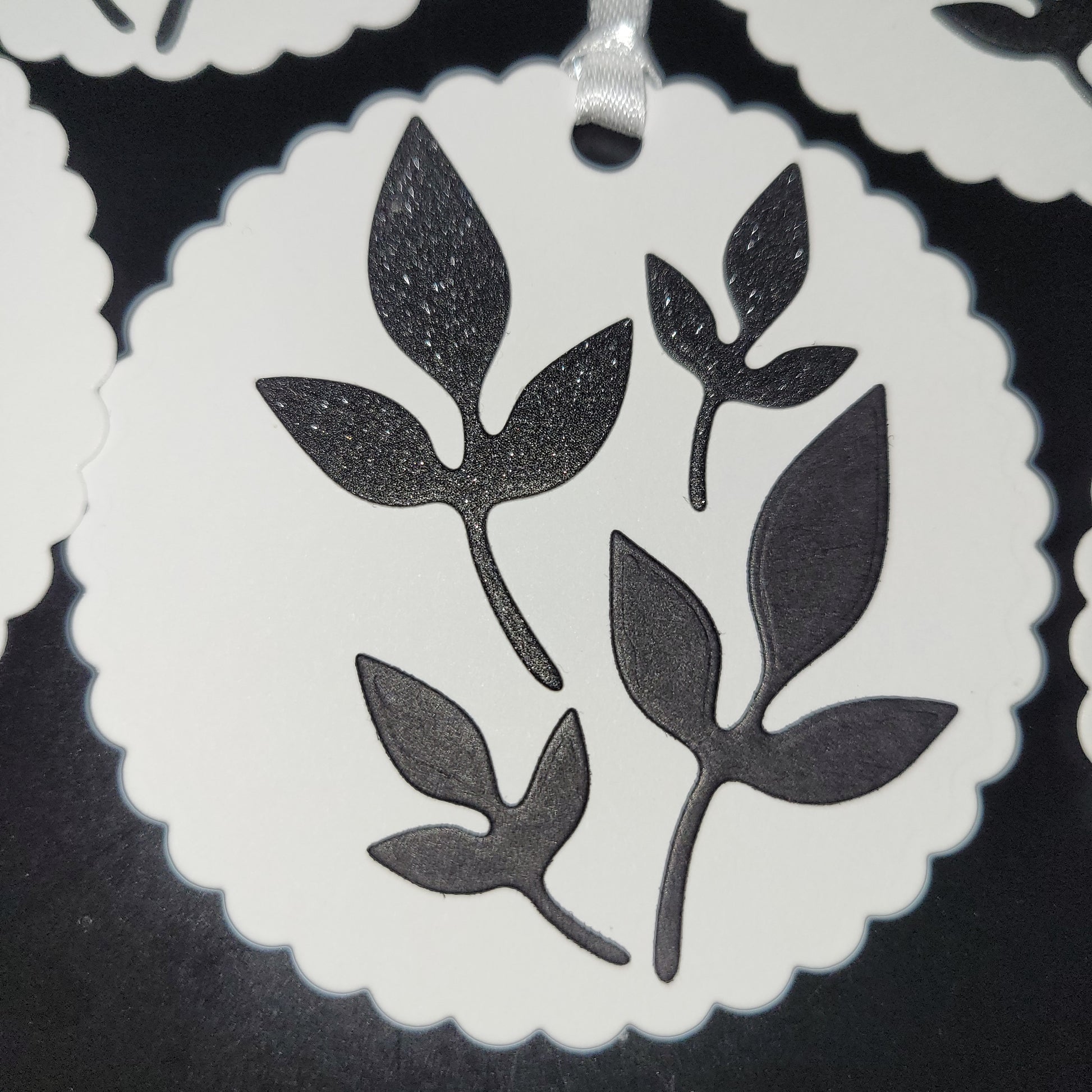 1x Fluted Circle white gift tag with black 3 leaf cutouts. 2 in plain black and two in shimmer black. One card from the available stock will be chosen at random as some leaves have slight variation of size.