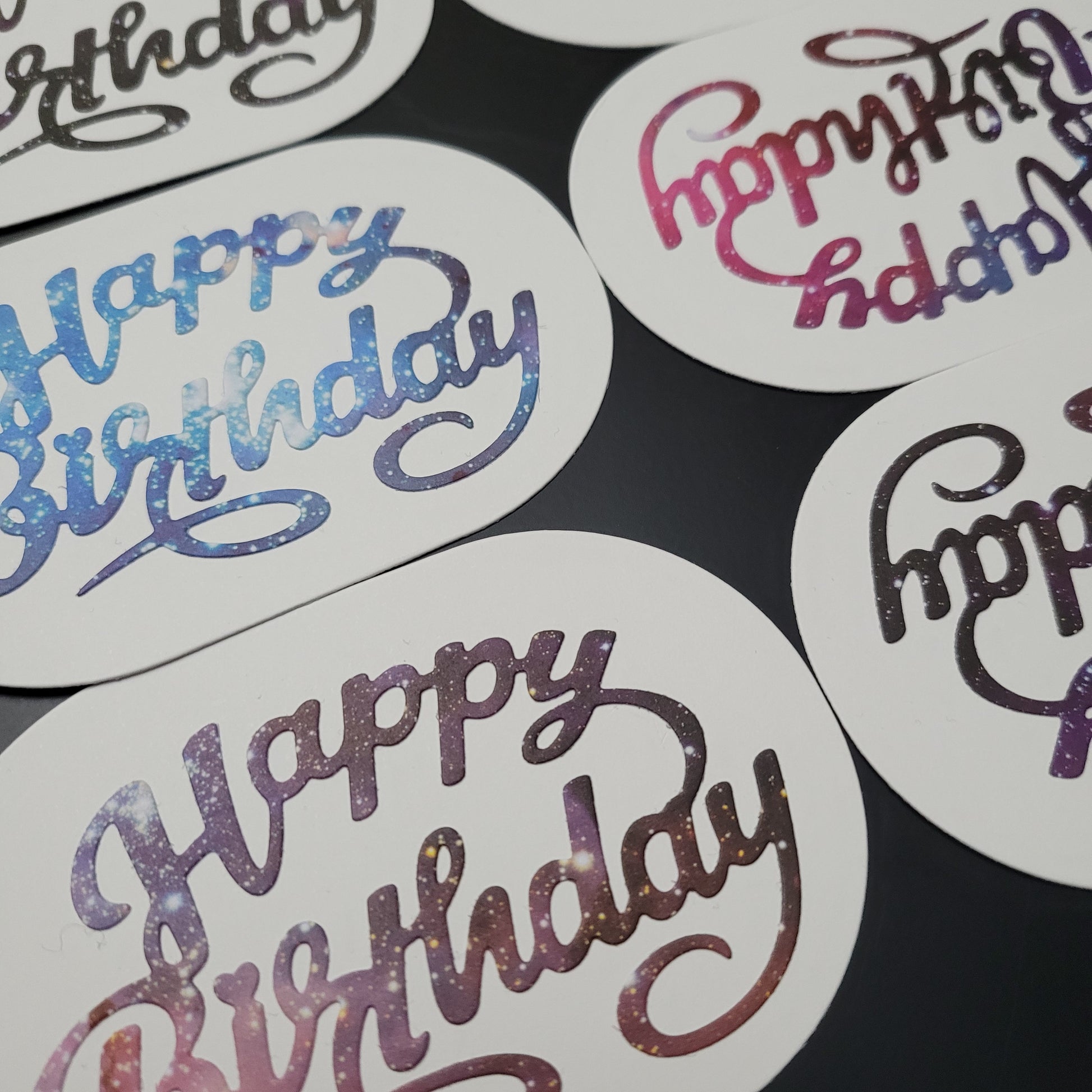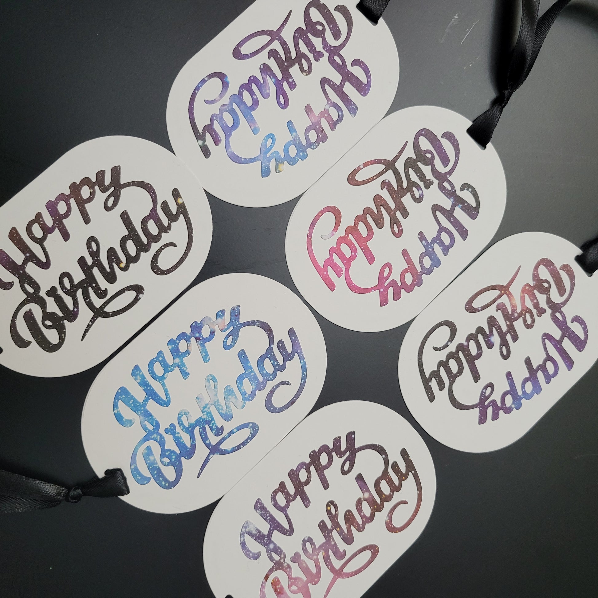 1x Oval white gift tag with nebula stars patterned Happy Birthday cutout