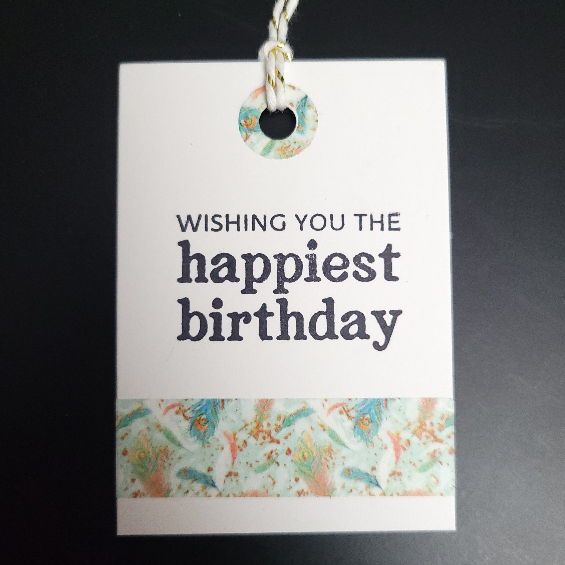 1 x 300gsm white card gift tags washi tape decorated stamped with a Birthday sentiment in black ink